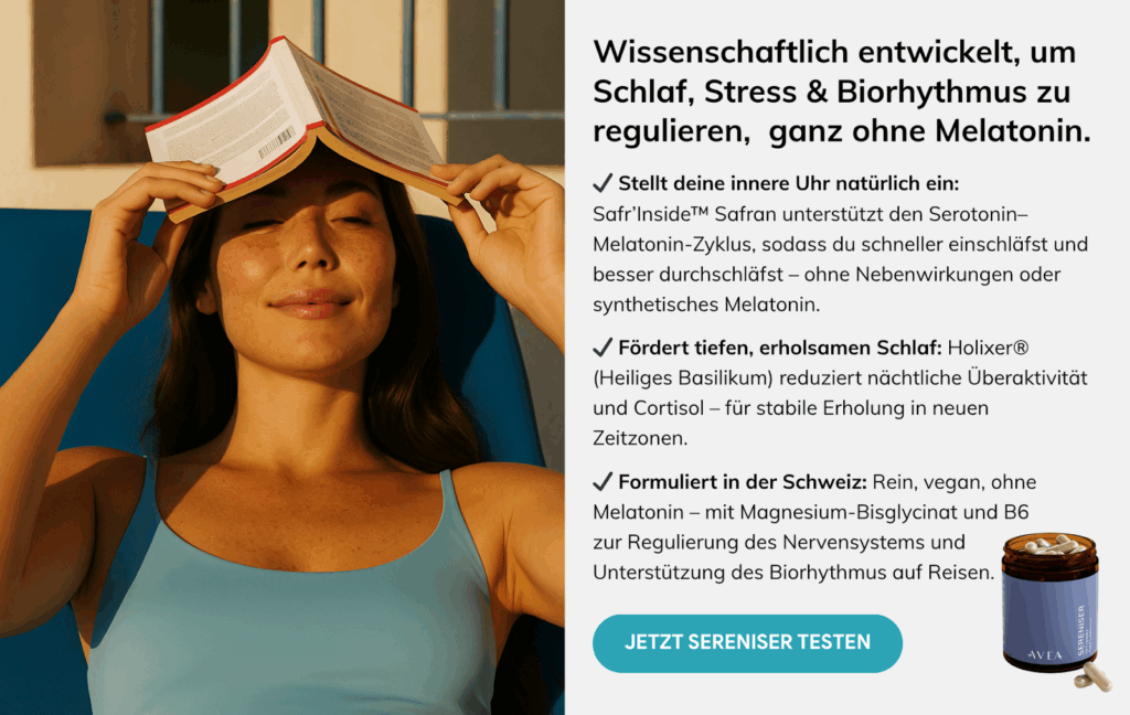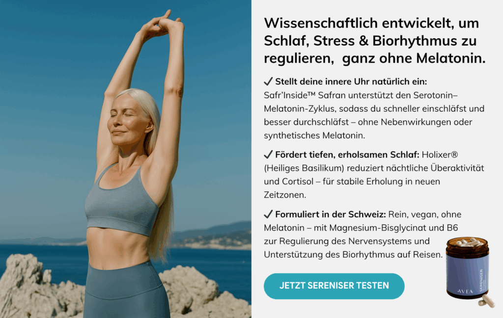 Wenn Sie verstehen, was Jetlag ist, warum er auftritt und wie Sie ihn effektiv bekämpfen, können Sie besser reisen und sich schneller erholen. Außerdem stellen wir Ihnen AVEA Sereniser vor – das wissenschaftlich fundierte Nahrungsergänzungsmittel, das Ihnen hilft, den ganzen Sommer über ausgeruht und voller Energie zu bleiben.