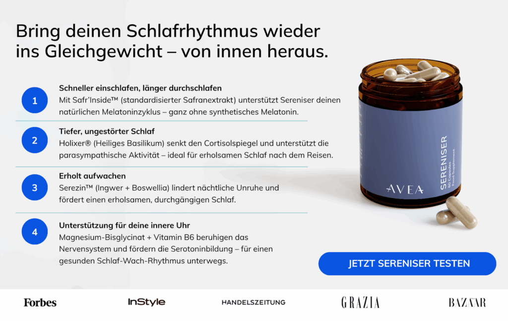 AVEA’s Sereniser ist deshalb nicht nur eine Hilfe auf Reisen, sondern ein täglicher Begleiter, der Körper und Geist auf natürliche Weise zur Ruhe bringt, ausgleicht und den Schlafrhythmus sanft neu ausrichtet. Ob du dich gerade an eine neue Zeitzone gewöhnst oder einfach zu Hause besser schlafen willst – der Sereniser unterstützt die gesamte Schlafarchitektur, ganz ohne Beruhigungsmittel und ohne synthetisches Melatonin.