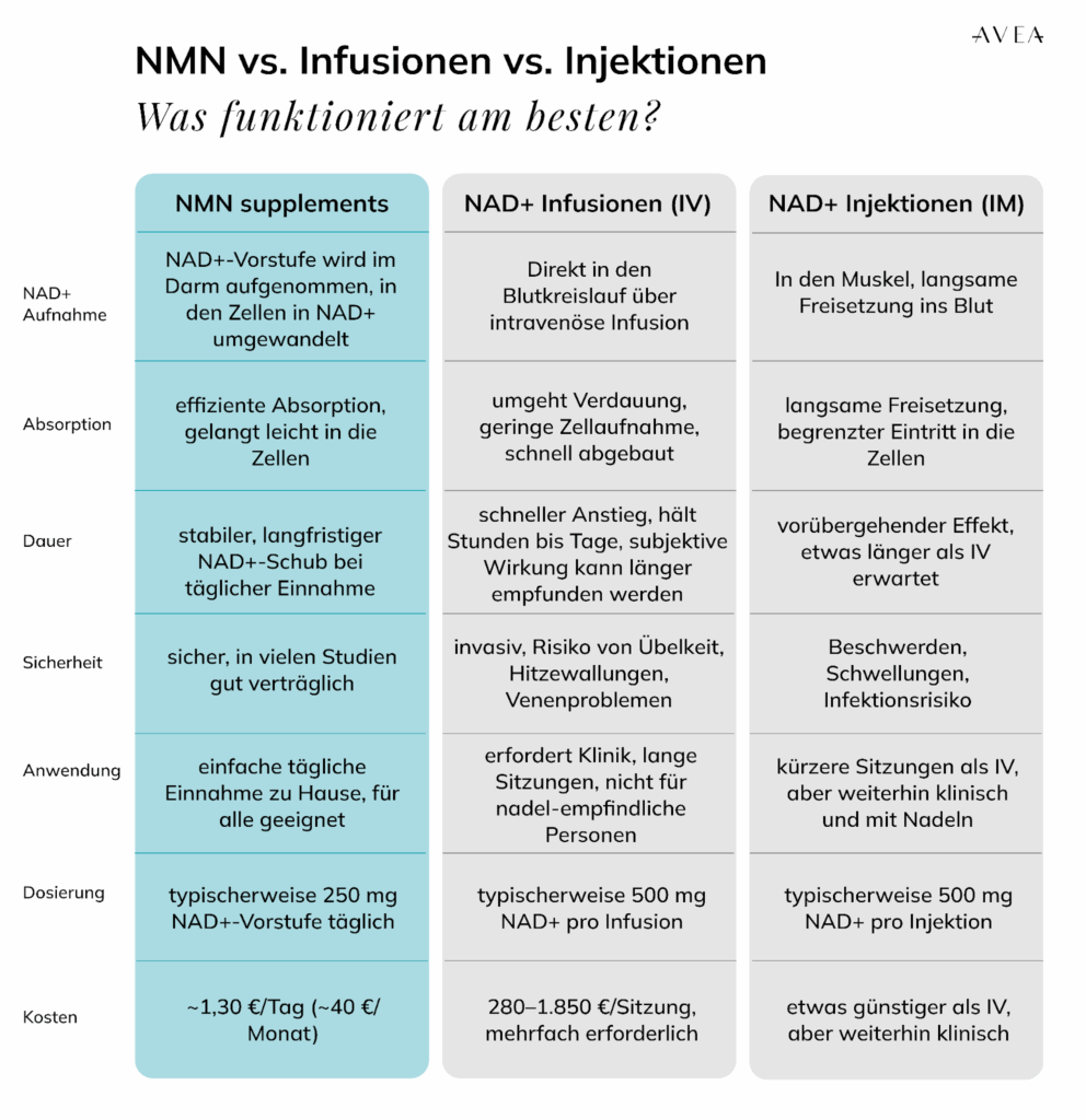 Im Vergleich der Kriterien Aufnahme, Wirkungsdauer, Sicherheit, Alltagstauglichkeit und Kosten bieten Supplemente mit NAD+-Vorstufen eine nachhaltigere und zugänglichere Strategie, um den NAD+-Spiegel langfristig zu unterstützen.