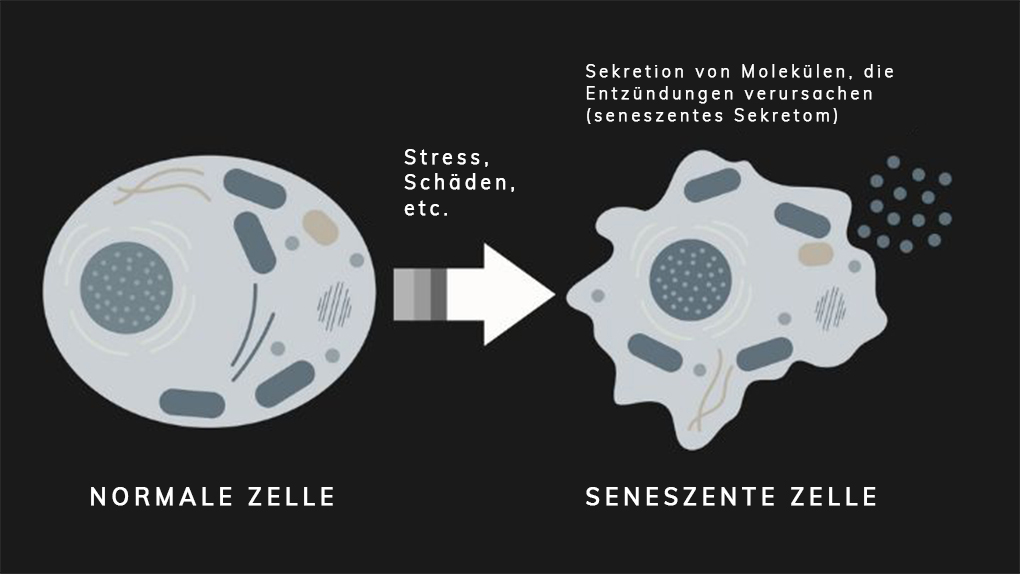Zelluläre Seneszenz gilt als Kennzeichen des Alterns. Sie führt zu Funktionsstörungen im Gewebe, da seneszente Zellen entzündungsfördernde Substanzen freisetzen {{{https://www.nia.nih.gov/news/does-cellular-senescence-hold-secrets-healthier-aging#:~:text=What%20is%20cellular%20senescence%3F,chemicals%20that%20can%20trigger%20inflammation.}}}.