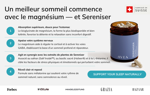 Chez AVEA, toutes nos formulations sont conçues dans un but précis : chaque ingrédient de Sereniser est sélectionné pour soutenir les systèmes biologiques qui régissent un sommeil réparateur et authentique, du rythme circadien et de l’équilibre des neurotransmetteurs à la réponse au stress et à l’architecture du sommeil profond.