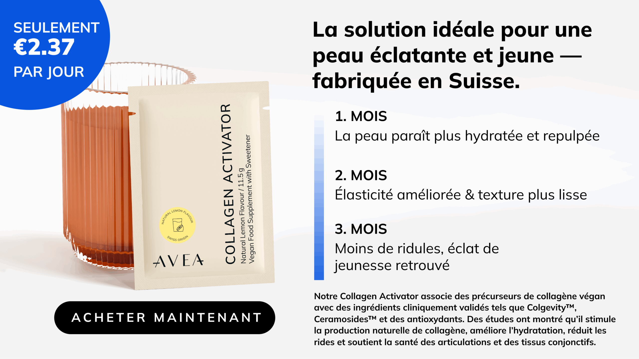 Le Collagen Activator d’AVEA contient du Colgevity™, un complexe d’acides aminés végétalien testé cliniquement et développé en collaboration avec l’ETH Zurich. Il s’est avéré jusqu’à quatre fois plus efficace pour stimuler la synthèse de collagène que les peptides de collagène conventionnels.