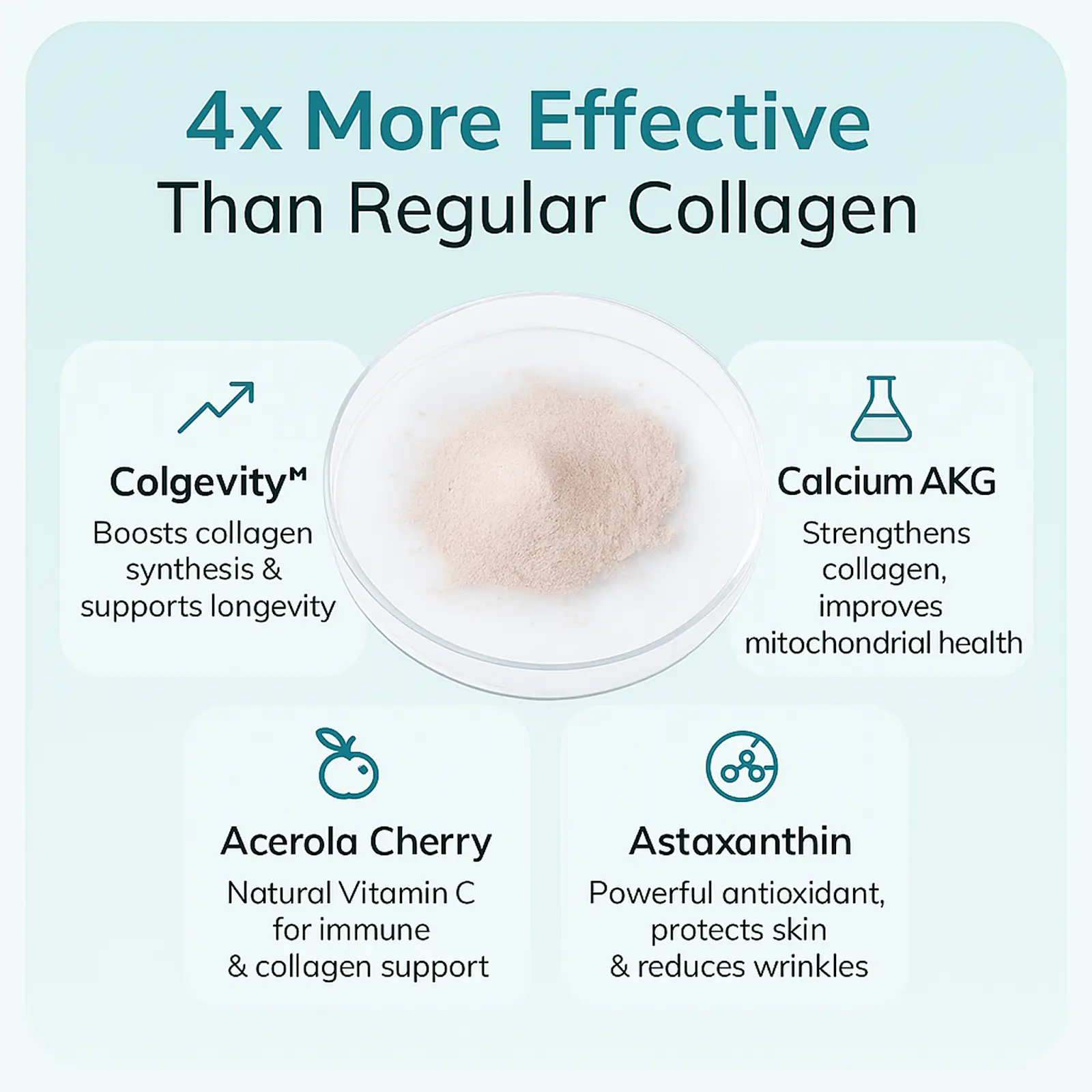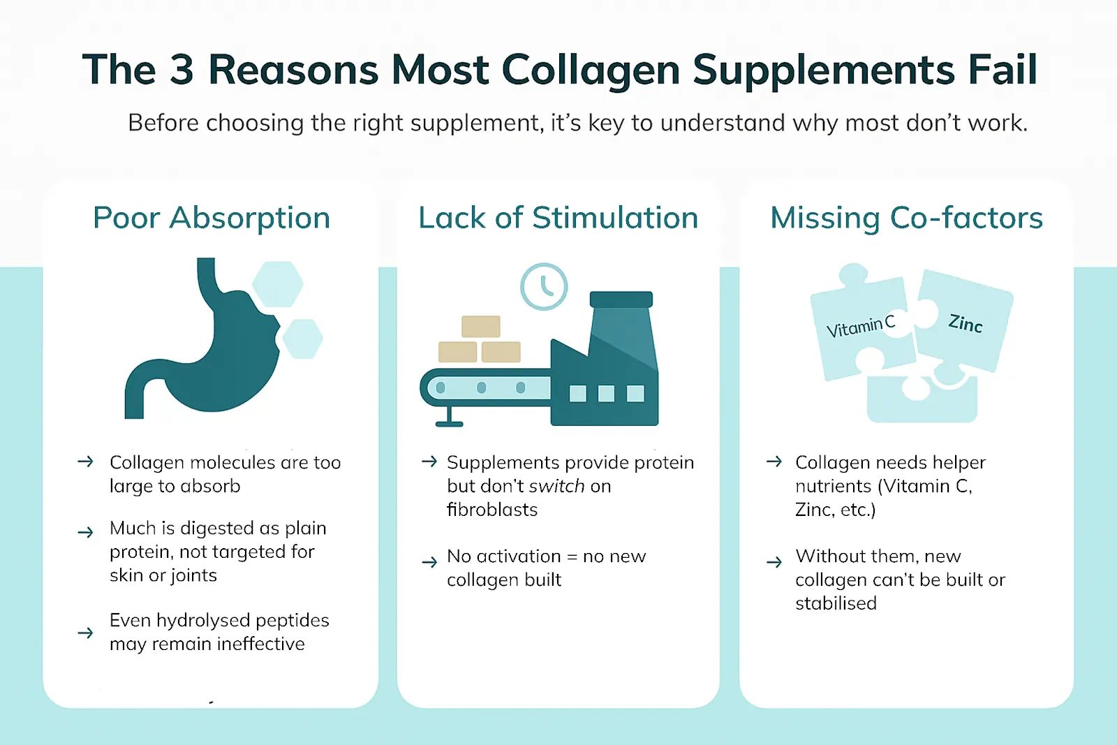 Recognising this, skincare experts agree that true skin transformation must start from within. This has led to a boom in collagen supplements. The problem? Not all supplements are created equal. Many are poorly absorbed or lack the key ingredients needed to activate your body’s own collagen-making machinery.
