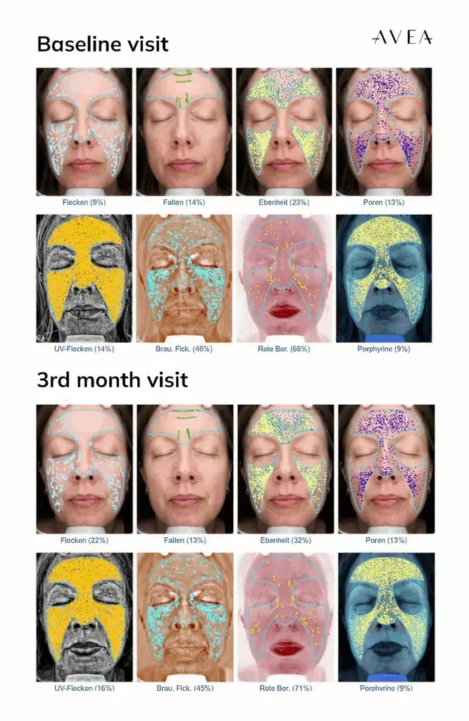 - Red areas (Inflammation): Reduced inflammation by 11.8% initially, with continued improvement to 4.4% by three months.