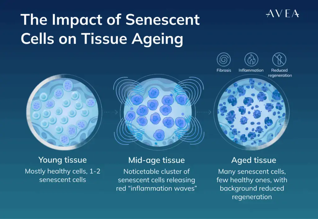 Senescent cells — often called “zombie cells” — are cells that have stopped dividing but don’t die. Instead, they linger in tissues, releasing inflammatory molecules (the senescence-associated secretory phenotype, SASP) that harm neighbouring cells, degrade tissue function, and contribute to age-related decline.
