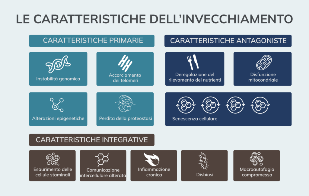 Nel 2013, un gruppo di ricercatori ha pubblicato uno studio fondamentale che identificava nove pilastri dell’invecchiamento – meccanismi interconnessi che guidano il processo biologico dell’età.