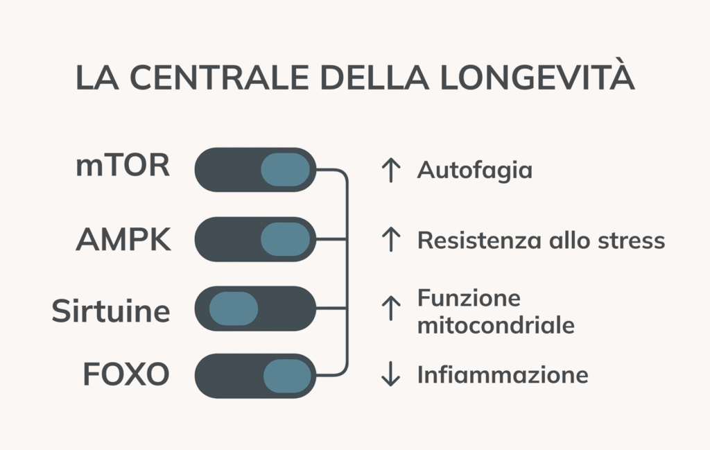 Si tratta di circuiti biologici conservati dall’evoluzione, che regolano le risposte cellulari allo stress, la gestione dell’energia e i processi di manutenzione e riparazione.