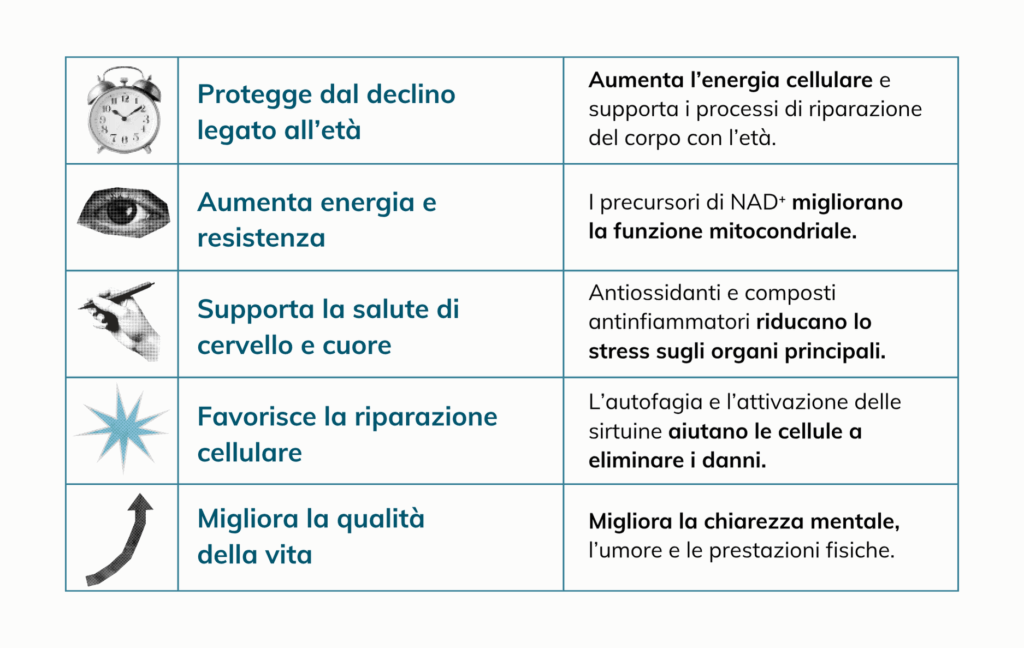 - CoQ10 (forma Ubiquinol) migliora la funzione mitocondriale e riduce lo stress ossidativo, protegge le cellule dai danni che altrimenti ridurrebbero i livelli di NAD+.