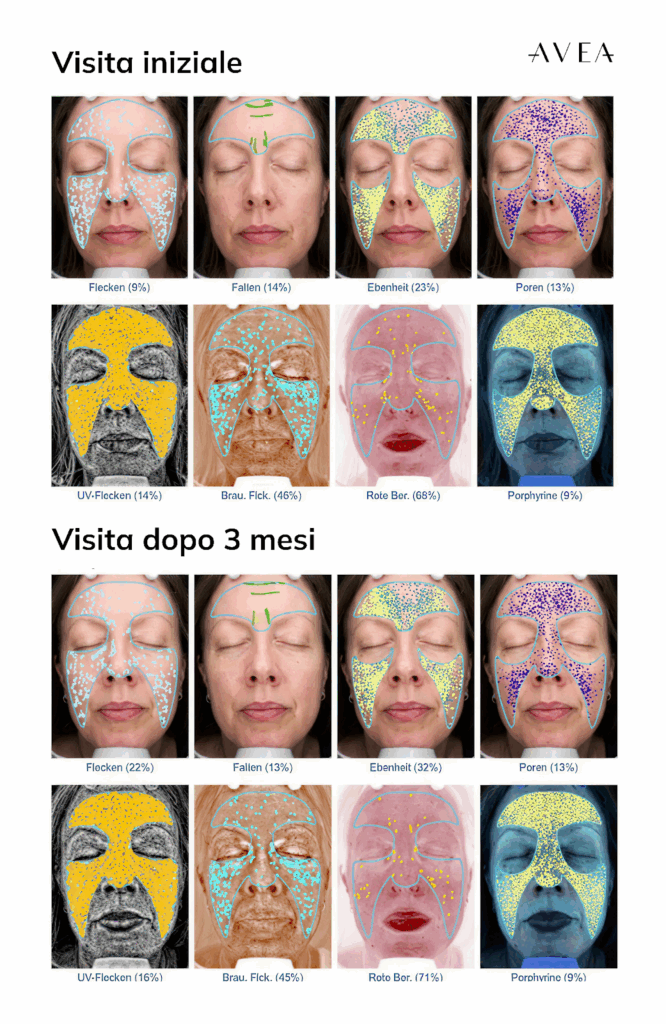 - Macchie brune: riduzione costante, pari al 4,3% nel primo mese e al 2,2% dopo tre mesi.