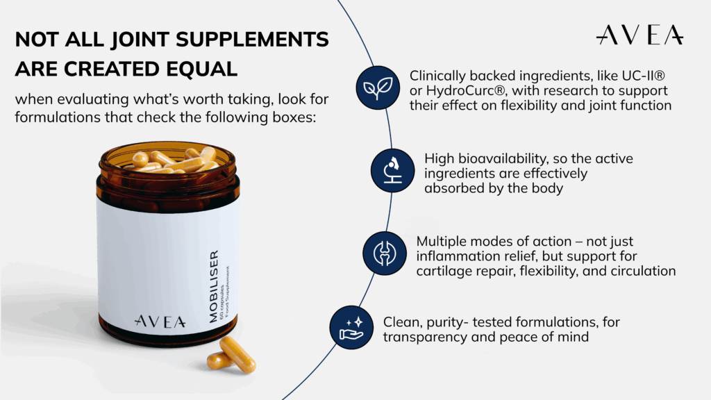 Not all joint supplements are created equal. When evaluating what’s worth taking, look for formulations that check the following boxes: