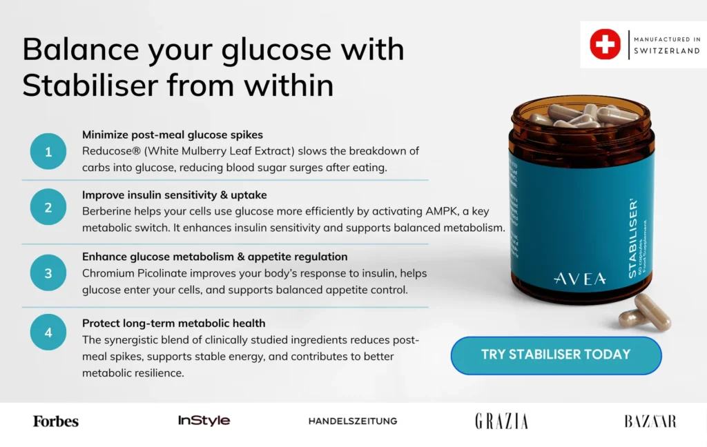 That’s where AVEA’s Stabiliser comes in. Designed for anyone who wants more energy, better metabolic health, and improved longevity, Stabiliser contains a clinically studied blend of three ingredients that help you take control of your glucose response—starting with your very next meal.