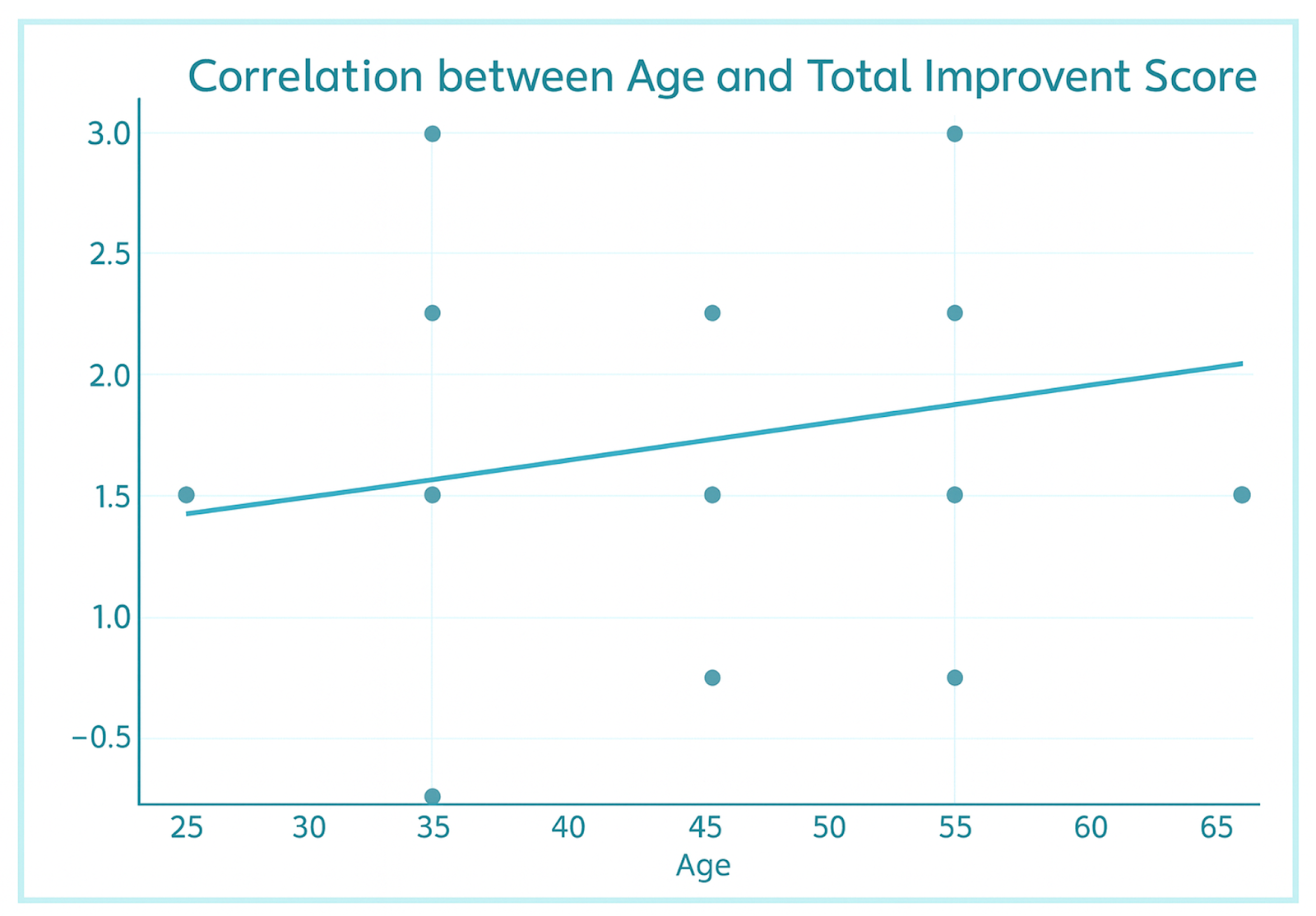 In addition, the second chart (a correlation plot) suggests that older participants tended to report slightly more overall benefits,  suggesting that age may influence the perceived efficacy of the product.