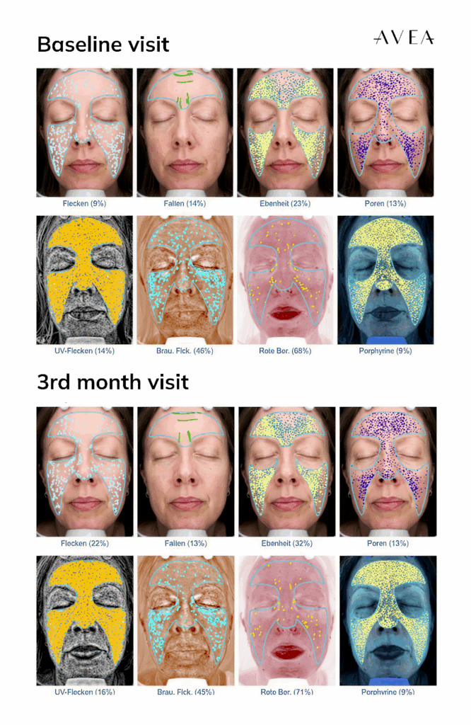 - Red areas (Inflammation): Reduced inflammation by 11.8% initially, with continued improvement to 4.4% by three months.