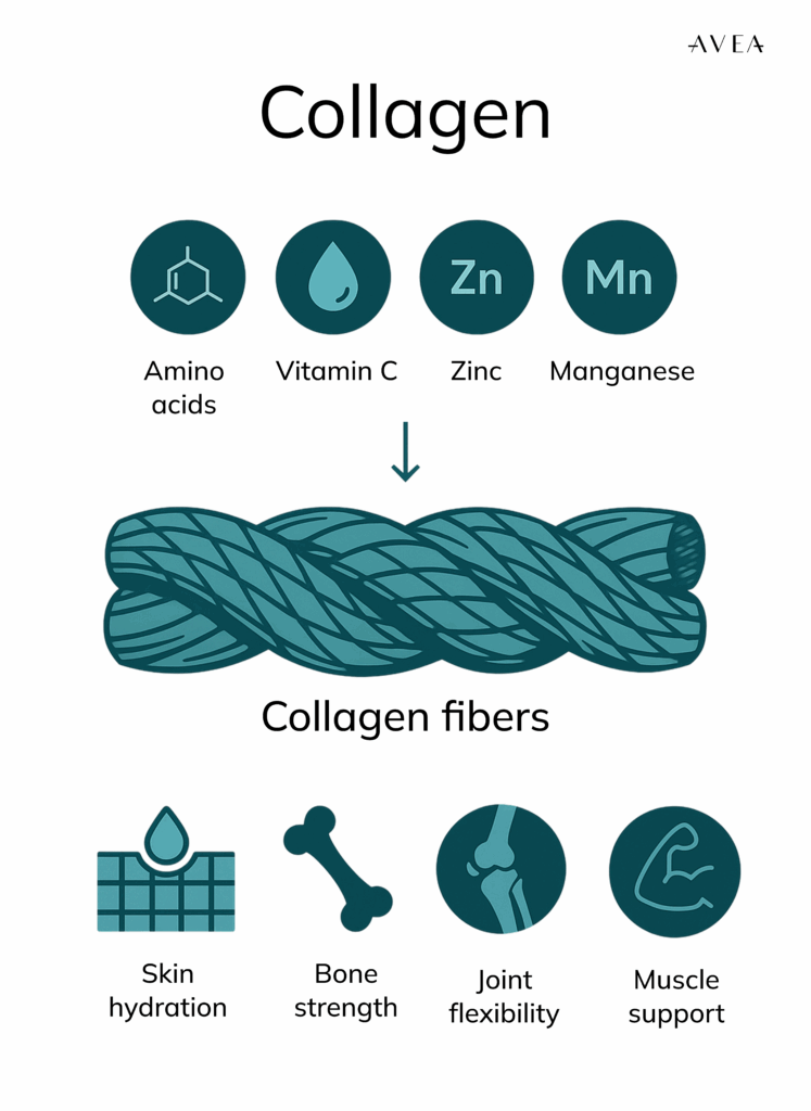 Collagen is the most abundant protein in the human body, making up around 30% of all protein. It’s built from 19 amino acids – with glycine, proline, and hydroxyproline forming the core structure. Together with essential nutrients such as vitamin C, zinc, copper, and manganese, these amino acids form strong, rope-like fibers that provide structure and support throughout the body.